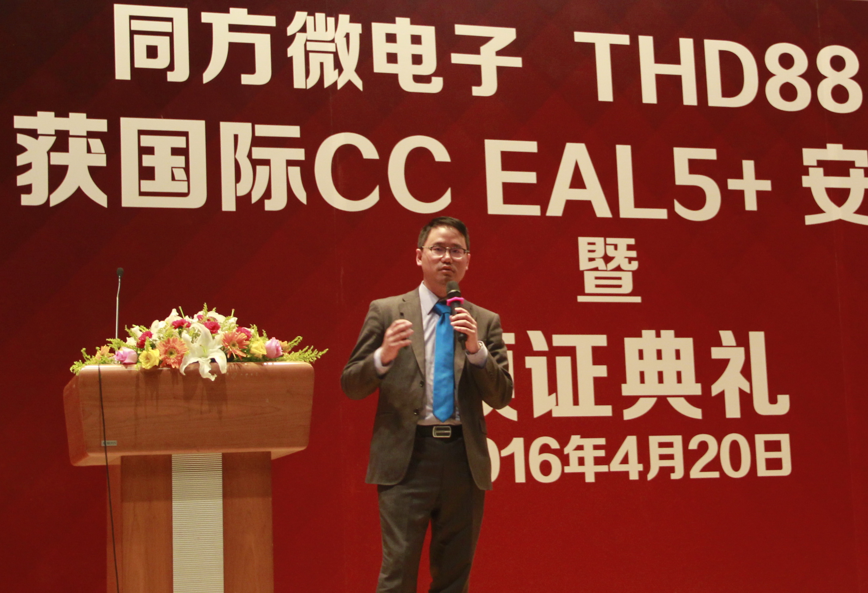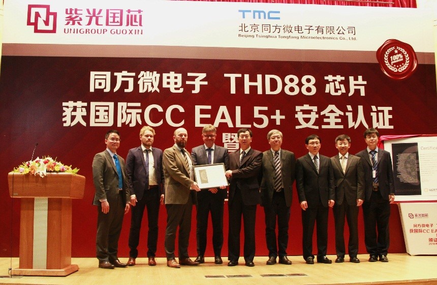 2016年4月20日,北京同方微电子有限公司(以下简称“同方微电子”)在北京清华同方科技广场C座国际报告厅召开CCEAL5+颁证典礼,挪威SERTIT安全认证部主任Kjartan正式向同方微电子总裁段立颁发了国际CCEAL5+安全认证证书,标志着公司自主研发的双界面金融IC卡芯片THD88/M2064(以下简称“THD88”)成为国内唯一一款获得该认证的芯片产品。zoty中欧股份有限公司(原名:同方国芯电子股份有限公司)领导、挪威SERTIT认证机构代表、荷兰Brightsight实验室代表、30多家合作伙伴代表、同方微电子公司全体员工共三百余人一起见证了这一历史时刻。